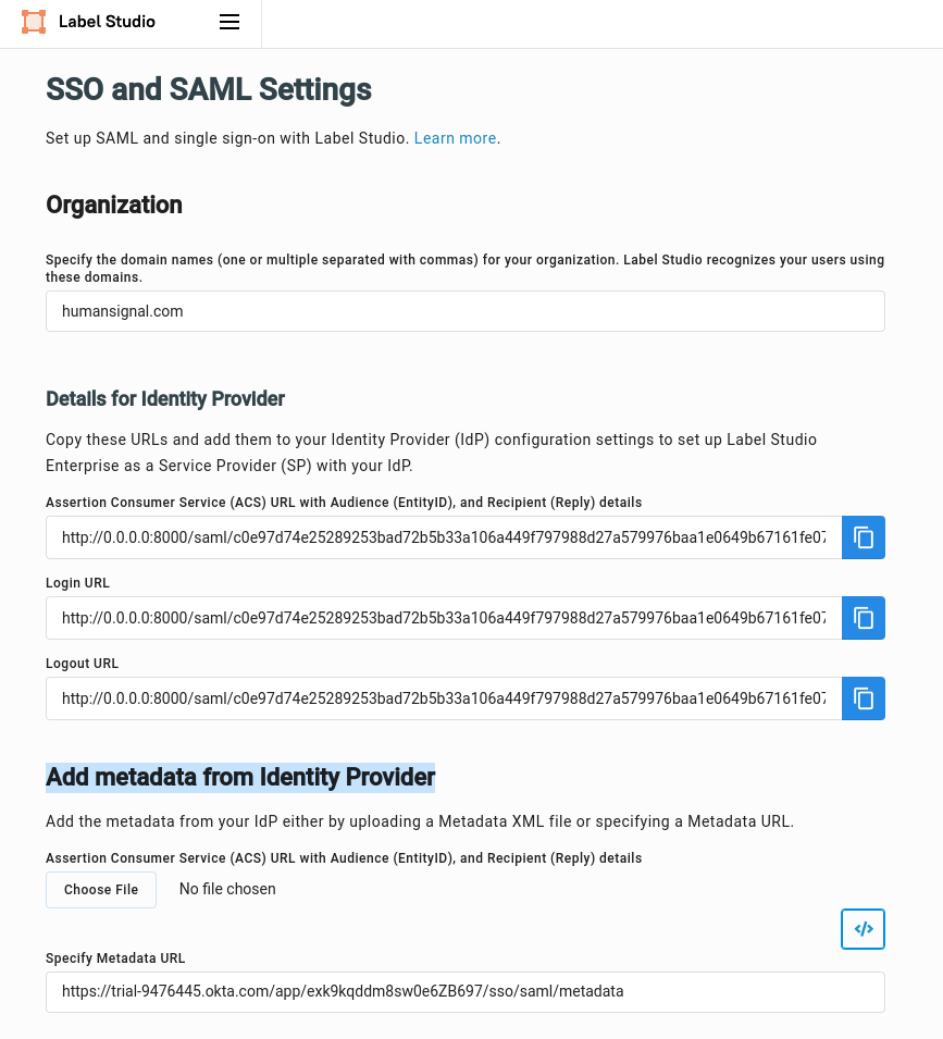 - When given the option, download the IdP metadata file for your new app. This file contains all the necessary information to configure Label Studio.